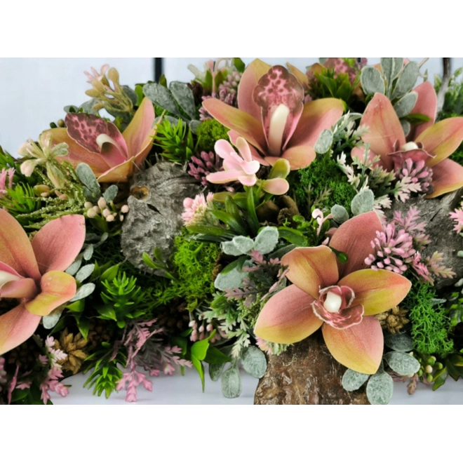 Színvilág: Zöld árnyalatok, rózsaszín-narancssárga orchideák, apró rózsaszínes virágok