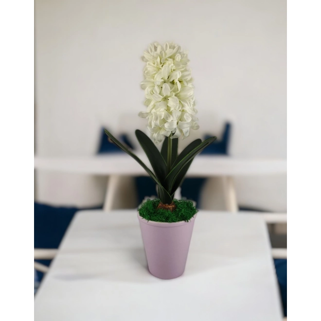 Élethű kinézetű, prémium minőségű jácint festett agyagkaspóban izlandi mohával díszítve. A virágfej selyemből, a levél valódi hatású gumiból készült.