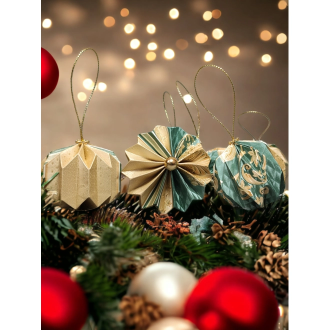 Ez a kézműves karácsonyi dekoráció origami technikával készült prémium minőségű gyönyörű papírból. A csomag 10 darab díszt tartalmaz, melyek különféle formájúak, zöld, arany színűek. Ezt a karácsonyi díszt többféleképpen használhatod, lehet a karácsonyfa éke, készíthetsz belőle girlandot egy szalagra fűzve, vagy karácsonyi ablakdíszként is nagyon szép.