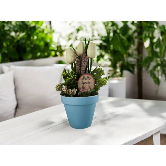 Gumi tulipánokból és tavaszi virágokból készült kompozíció festett agyagkaspóban izlandi mohaágyon "Hello Tavasz" fatáblácskával.