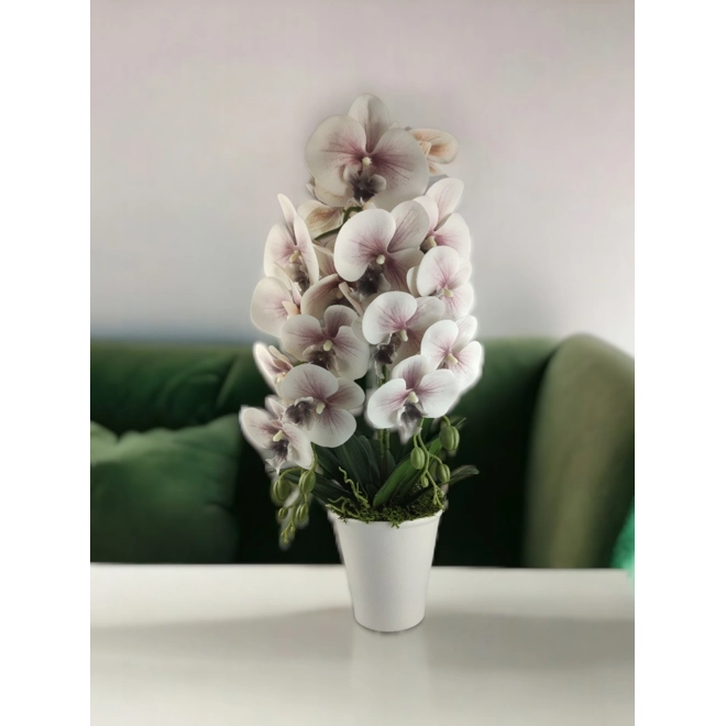 Ez a nagy kétszálas élethű orchidea színes agyag kaspóban tökéletes kiegészítője minden otthonnak vagy irodának, egy csipetnyi kifinomultságot kölcsönöz minden térnek. A valósághű szirmok és levelek tartós, gumis anyagból készültek. Élénk színeivel, a buja zöld mohaággyal és valósághű kialakításával ez a vidám, természetes kompozíció minden szoba központi eleme lesz.