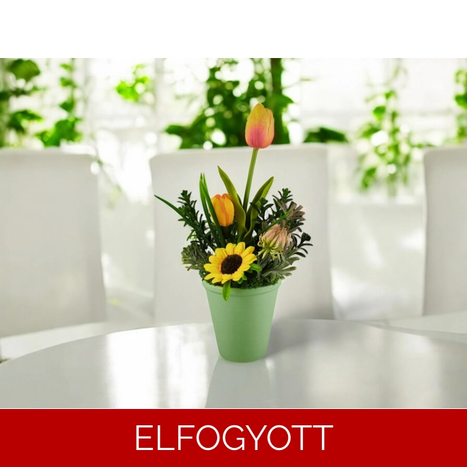 A virágkompozíció teljes magassága kb 28-30 cm, a kaspó átmérője kb. 8 cm.