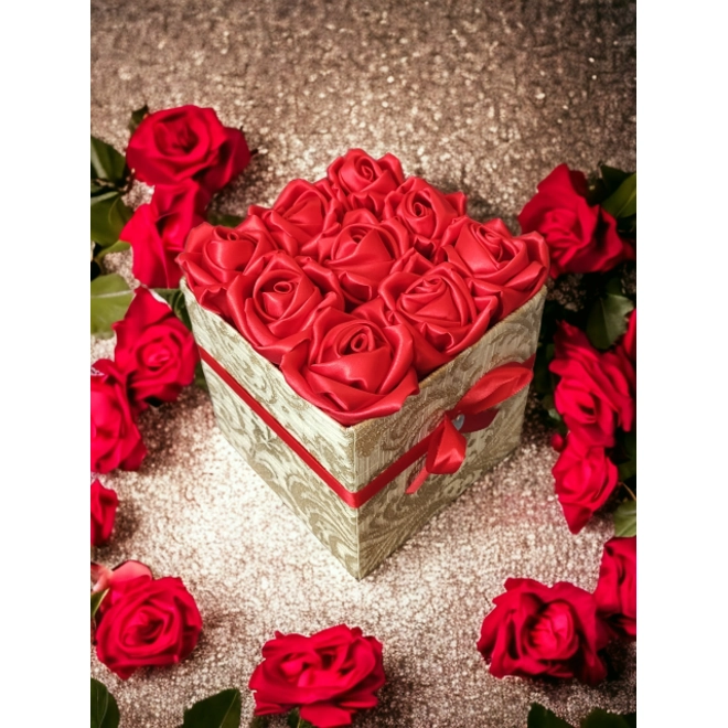 Egyedi rózsabox 9 szatén rózsával. Tedd különlegessé az ajándékozást ezzel a kézzel készített szaténrózsa boxszal. Ez a gyönyörű dísz egy tökéletes kombinációja a romantikus szépségnek és a kreatív designnak, így garantáltan örömet fog szerezni a megajándékozottnak.