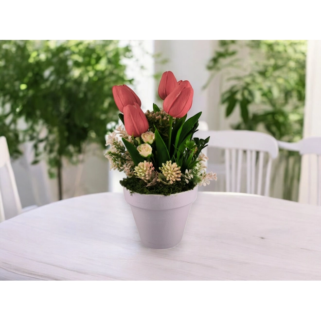 Gumi tulipánokból készült kompozíció 5 tulipánnal festett agyagkaspóban izlandi mohával, tavaszi virágokkal és izlandi mohával díszítve.